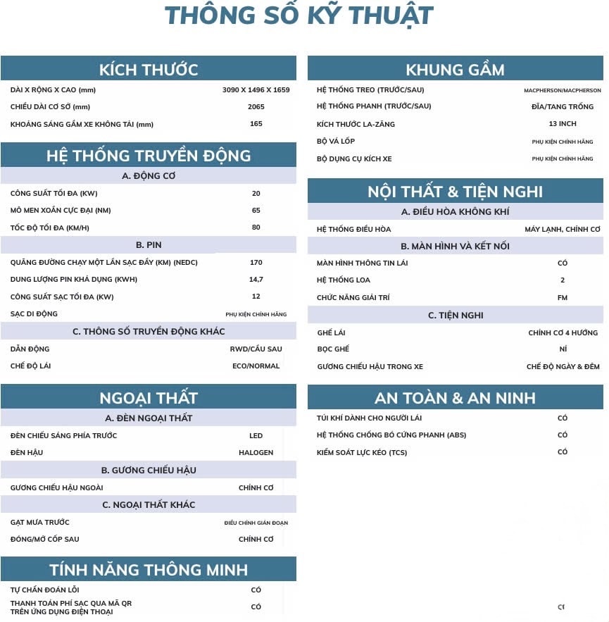 Xe vận hành cực kỳ êm ái, không gây tiếng ồn, không khói bụi – rất phù hợp với môi trường đô thị và các khu dân cư đông đúc. Với mô-men xoắn cao ngay từ khi khởi động, xe tăng tốc mượt, đặc biệt hữu ích khi vượt dốc hoặc quay đầu trong ngõ nhỏ.