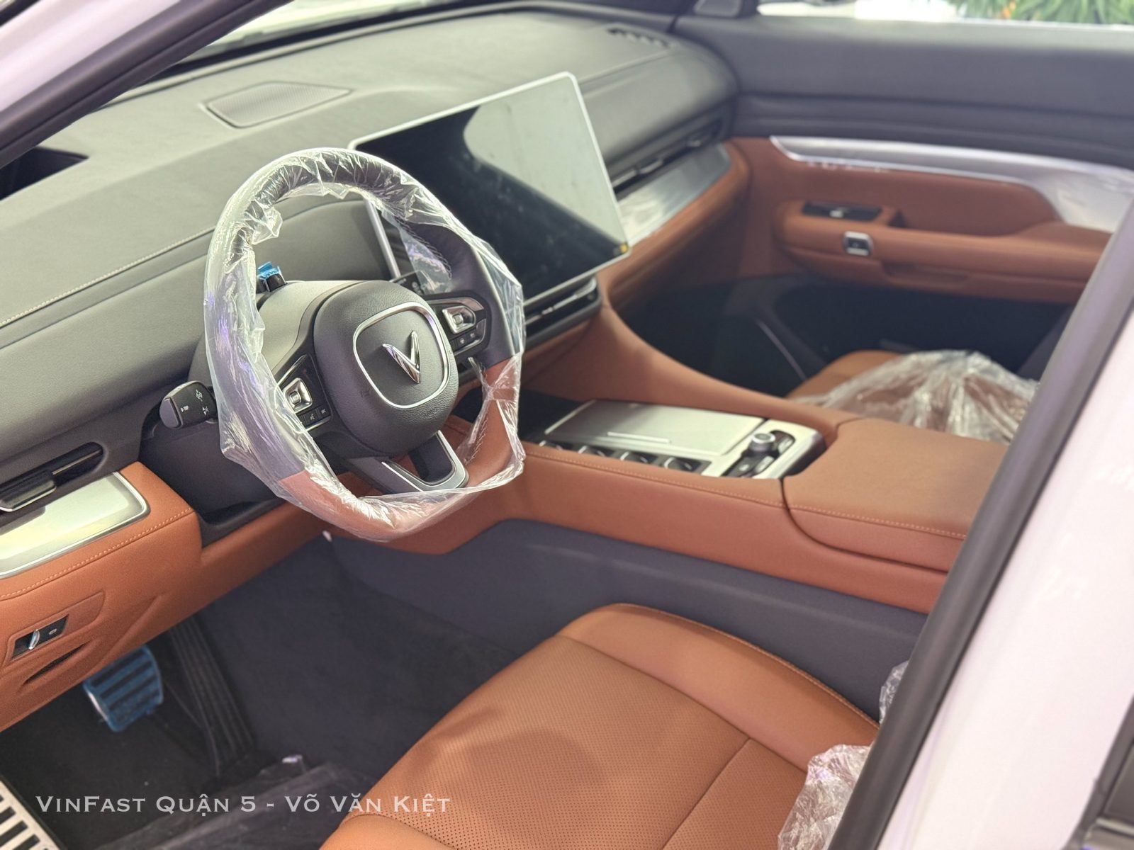 Vô-lăng xe VinFast VF9 2025 thiết kế dạng D-cut với khu vực trung tâm hình chữ nhật bo tròn, ôm trọn logo thương hiệu. Cụm đồng hồ hiển thị thông tin không còn nằm phía sau vô-lăng mà đã được tích hợp luôn vào màn hình trung tâm. Cần số dạng nút bấm giống như thiết kế thường thấy trên các mẫu siêu xe.